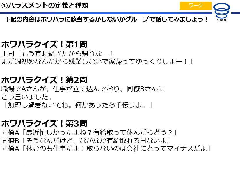 ハラスメントが及ぼす影響として、従業員のモチベーション低下、退職、社内トラブル、SNS拡散による企業イメージの悪化など、経営リスクをデータや実際の判例も交えてご紹介。「たった一言が会社全体に影響を与える」というリアリティを共有しました。また、「これってハラスメント?」という事例を基に、自身の発言や態度をチェックするワークを実施。「相手の立場に立つ」視点の大切さを、実感いただける内容を実施いたしました。