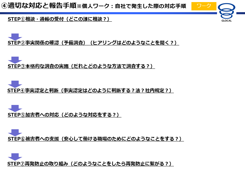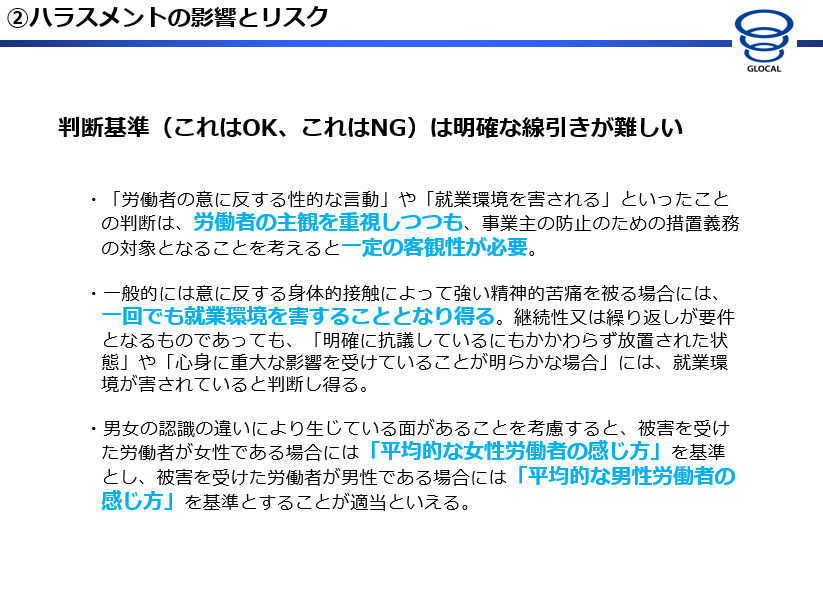 万が一、ハラスメントが発生した際の初動対応の重要性を強調し、適切な対応方法をお伝えしました。二次被害(セカンドハラスメント)に繋がるケースなどを紹介しました。報告を受けたときの受け止め方、相談窓口の明示、記録の残し方まで、実務に即した解説を行いました。