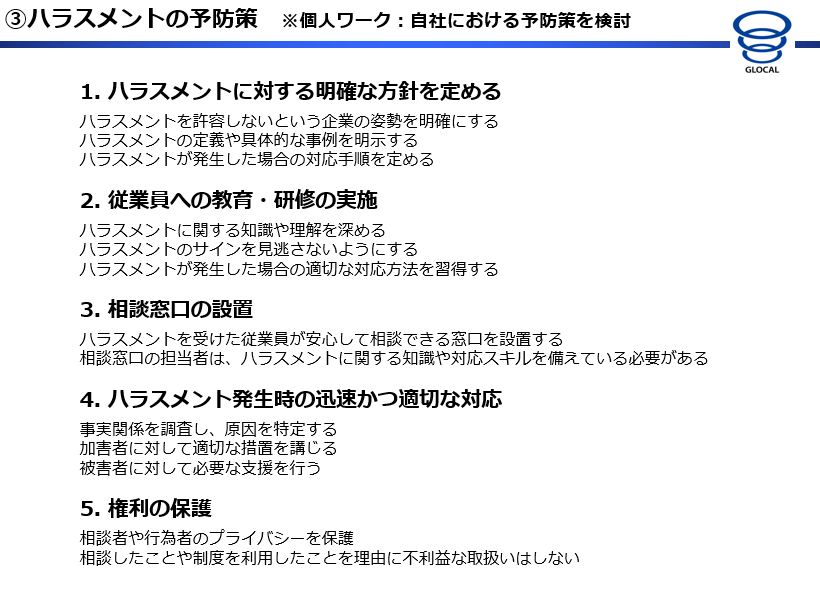 会社として実施するべき、ハラスメントに対して明確な方針の設定方法や従業員が気軽に相談できる相談窓口の設置方法などご説明させていただきました。また、管理職に求められる日頃の声かけや、定期的な1on1、相談しやすい雰囲気づくりの工夫など、組織としての予防策をお伝えしました。組織全体での「価値観のすり合わせ」の重要性にも触れ、「何がOKで、何がNGか」を明文化する手法も紹介しました。