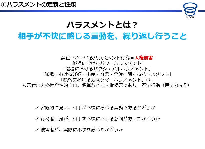 世間で認知の高いパワーハラスメント・セクシュアルハラスメント・マタニティハラスメントなどの種類に加え、昨今話題のカスタマーハラスメント・ホワイトハラスメントなど「不当なクレーム」「世代間ギャップ」「無意識の偏見」によるハラスメントについても取り上げました。法的な定義だけでなく、受け手の感じ方の重要性を重視し、「グレーゾーンの認識」を深める内容にしました。