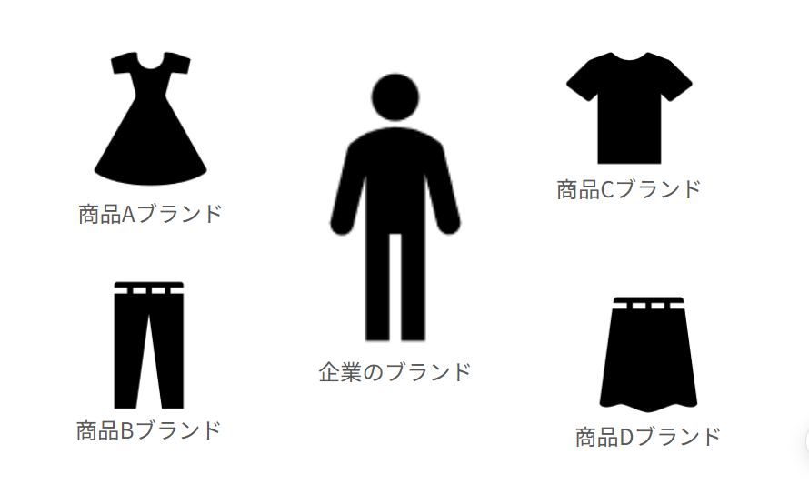 「企業ブランド=服を着ていないあなた自身へのイメージ」「商品ブランド=洋服であり自社商品、サービスのイメージ」と想像してください。ここで気を付けていただきたいのはあくまでイメージであり商品サービスの機能(洋服で言うと暖かい、伸びる生地)ではありません。