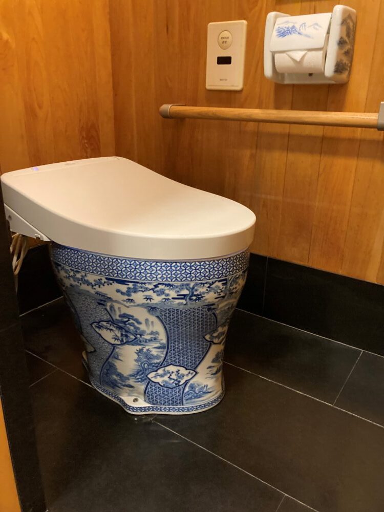 話し合いが続く中、私は席を立ちました。そして、廊下の向こうのお手洗いのドアを開けて驚きました。山重本店のお手洗いは、有田焼でできたおトイレだったのです。