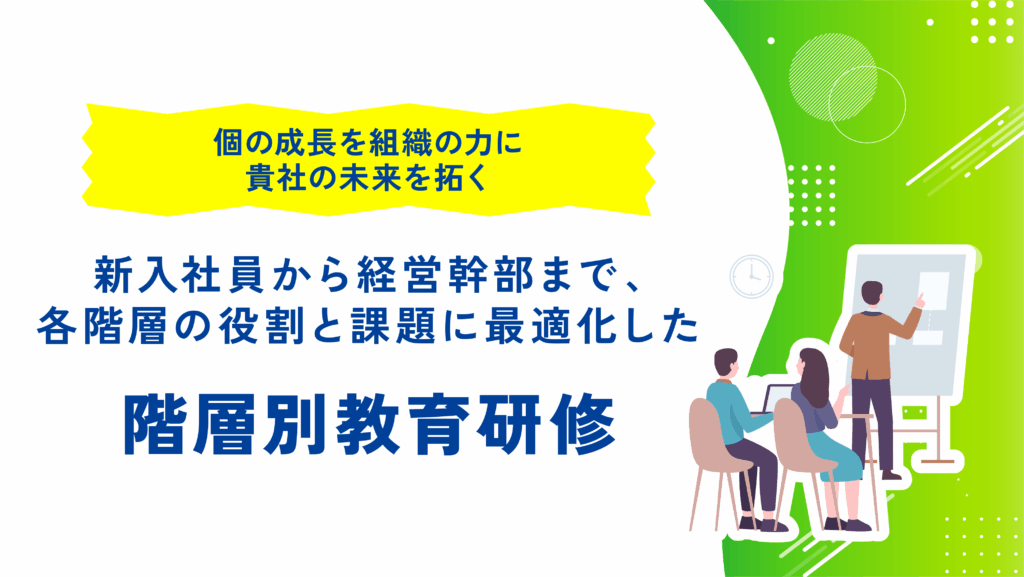 個の成長を組織の力に。貴社の未来を拓く、体系的な階層別教育プログラム 新入社員から経営幹部まで、各階層の役割と課題に最適化した研修をご提案します