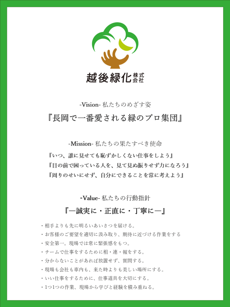 VMV策定によって「越後緑化らしさ」という曖昧だった概念が、明確に言語化されました。これにより会社として進む方向が「代表の意向」ではなく「会社の方針・指針」として周知できるようになりました。また日頃の業務改善や指導においても『誠実に・正直に・丁寧に』 という行動指針になったことで、社員一人ひとりが「会社の一員」としてどう振る舞うべきかが明確になりました。これにより、社内の一体感が醸成され、やりがいの向上やコミュニケーションの増加といった効果が生まれています。今後は採用活動においても「職人になりたい人」ではなく、「越後緑化のビジョンに共感し、サービス業としての造園を担える人」を見極めることができ、組織作りをさらに進めることが期待されます。