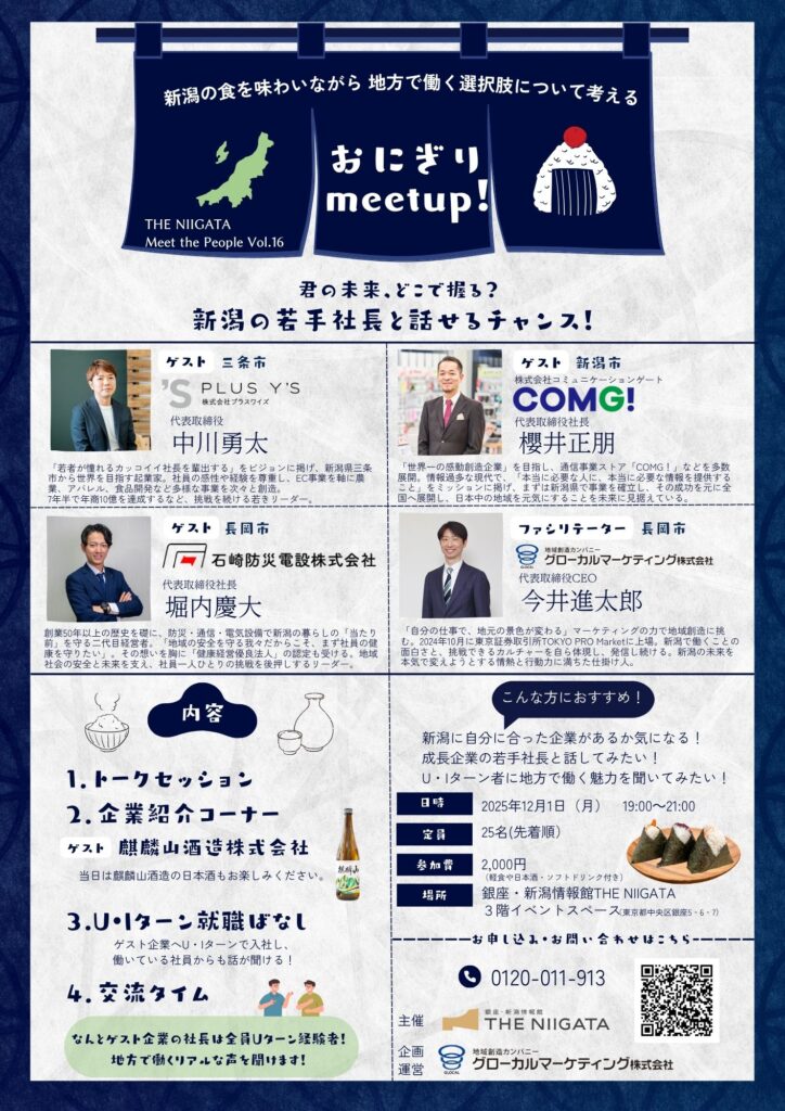この度、グローカルマーケティング株式会社は、新潟の食を味わいながら、新潟で活躍する企業トップと参加者がフラットに語り合うイベント「おにぎりmeetup!」を企画・運営いたします。